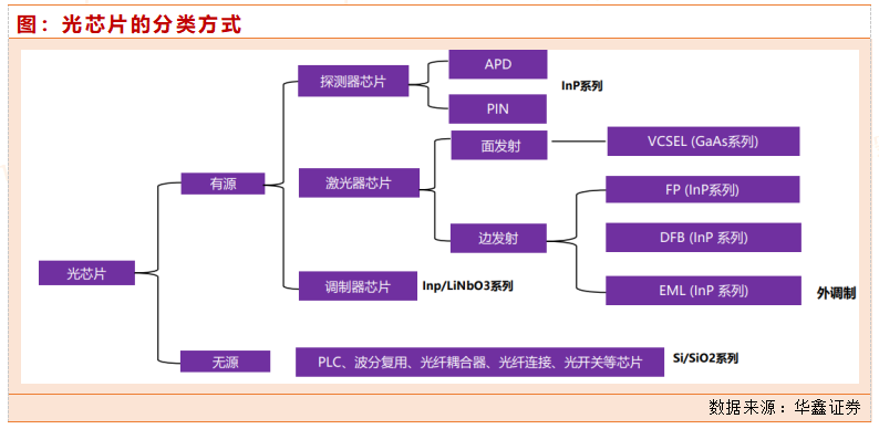 光芯片可以被分为有源光芯片和无源光芯片,有源光芯片可以进一步被分为激光器芯片、探测器芯片和调制器芯片。激光器芯片方面,按照发光类型可以分为面发射与边发射。其中,面发射型激光主要为VCSEL;边发射型激光包括FP、DFB和EML等,传统的FP激光器芯片因损耗较大且传输距离短在光通信领域的应用逐渐收窄,因此核心激光芯片主要有三种:DFB、EML和VCSEL。按照调制类型可以分为直接调制(DML)和外调制(EML)。DML有电路直接控制激光的开关,DFB是最常用的直接调制激光器,主要应用于中长距离传输;EML激光通过在DFB的基础上增加电吸收片(EAM)作为外调制器,啁啾与色散性能均优于DFB,更适用于长距离传输。