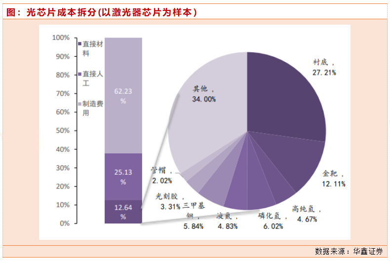 光芯片(以激光器芯片为例)的主要成本可以被分为直接 材料、直接人工及制造费用,分别占比12.64%、25.13%、62.23%。制造费用主要由折旧费、装修费摊销、水电费等构成,直接材料主要由衬底、金 靶、特殊气体、金属有机物等构成。其中,衬底材料基本决定了激光器的波长、频率和颜色等工作性能参数。根据源杰科技,衬底材料占比在27.21%,近些年占比有逐步下滑的趋势,原因主要系衬底材料的单价下滑和部分衬底材料的国产化。