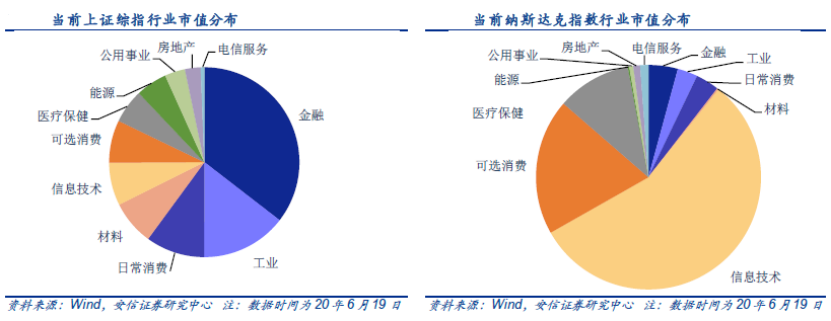 安信证券统计数据显示,目前在纳斯达克指数中,科技、医疗、消费三大类行业的合计市值权重超过90%,其中仅信息技术行业的市值占比就超过一半;而上证综指的行业分布中金融和制造业等传统行业占比超过50%,指数受经济周期影响较大。