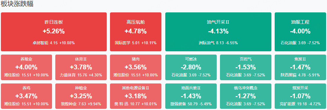 板块方面,电网设备产业链、农业产业链、CPO等板块表现活跃,油气概念、煤炭、MLED等板块表现落后。截至收盘,沪指涨0.25%,深成指涨0.8%,创业板指涨0.85%。