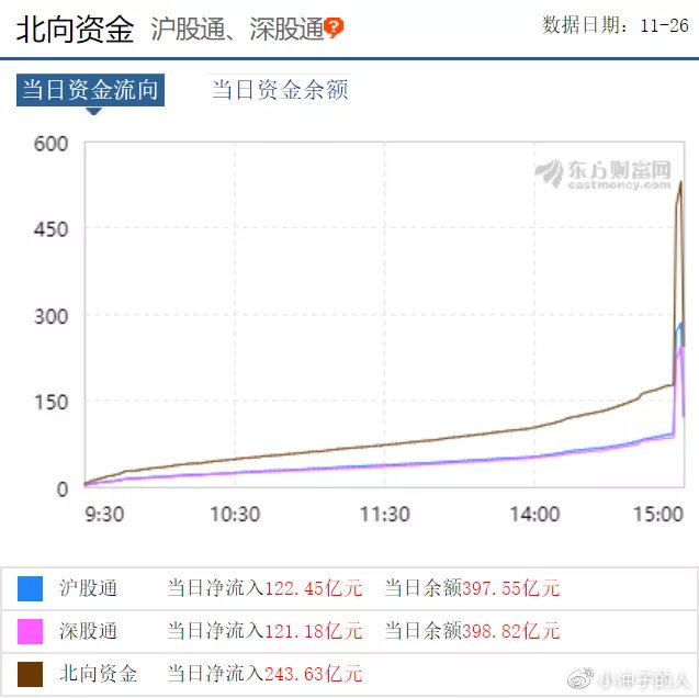 据东方财富网挂单数据,26日14:56时,北向资金净流入177.68亿元;14:57时,北向资金净流入陡升至487.07亿元;14:58时,北向资金净流入继续攀升至506.99亿元;14:59时,北向资金净流入达到全天高点529.86亿元;15:00时,北向资金净流入回落至243.63亿元。
