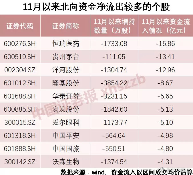 凯丰投资则指出,临近年底,北向资金也有落袋为安的趋势。从上周情况看,大基建、金融等估值偏低品种受到北向资金热捧,叠加市场低迷所致的破净股数量上升,上周北上资金大幅增持了宝钢股份、建设银行、中国银行等破净股。上周除了大幅减持贵州茅台外,对于年内涨幅巨大的恒瑞医药、招商银行、中国国旅等也大幅减持。