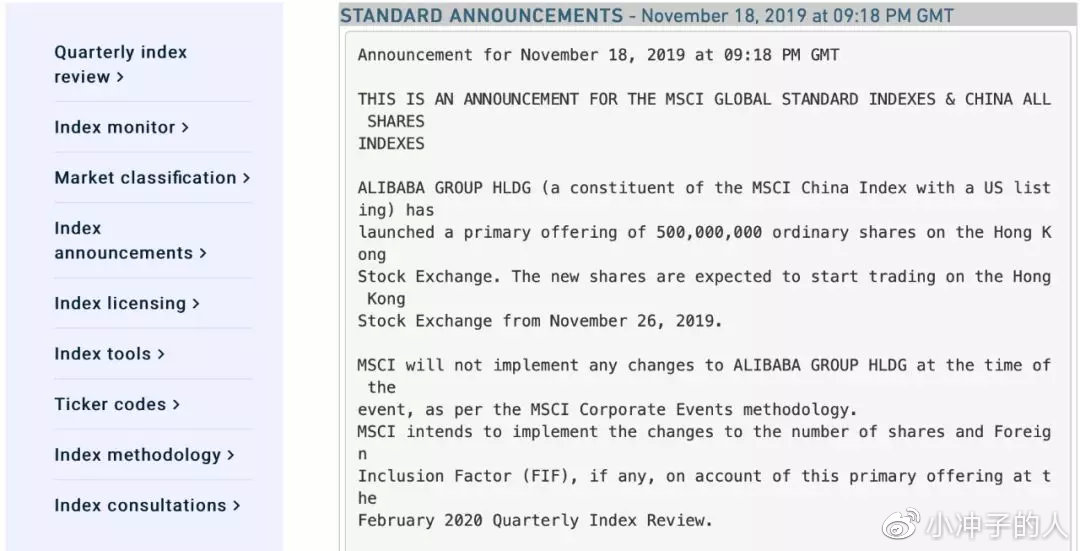 19日消息,MSCI发布公告称,MSCI中国指数成分股、MSCI新兴市场成分股阿里巴巴5亿新股11月26日开始在香港上市交易时,公司暂不就其股份数量变化作任何调整。MSCI计划在明年2月进行指数季度审核时,对阿里巴巴股票数量及其与香港上市相关的自由流通调整因子作出调整。
