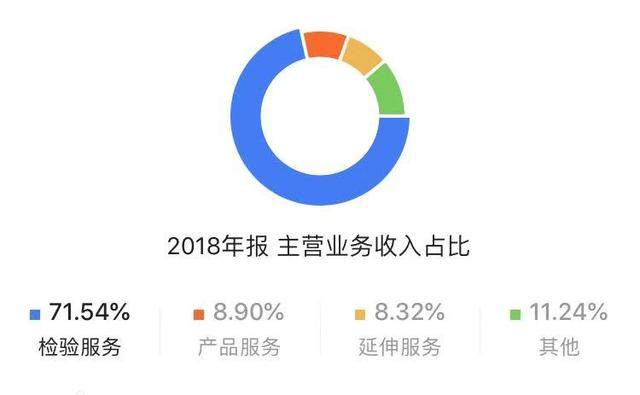 而我们今天要讲的公司——国检集团,属于建筑行业的第三方检验龙头,建工建材检测是当前中国检测行业最大的细分市场,2018 年整个建检行业实现营收 723亿,占全国检测市场比重达 25.7%,有券商预计,在2020年整个建检市场规模会在900亿左右。下图为国检集团2018年主营业务占比。