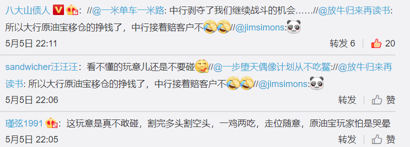 值得注意的是,与中行不同,工行、建行、民生等银行都在一周前为客户完成移仓。“现在回想起来,真的庆幸工行账户北美原油早早就自动移仓了,不然后果难以想象。”有投资者说。