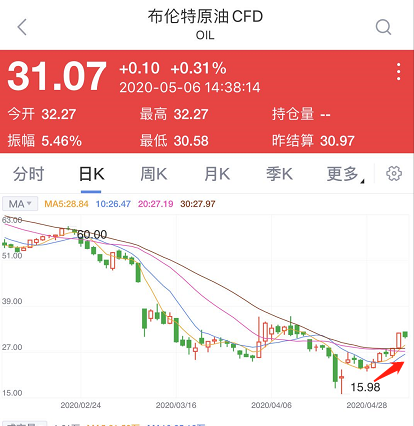4月30日,在多家石油公司宣布大规模减产计划和美国政府可能会对石油企业提供救助等消息刺激下,国际油价大涨,WTI原油当日暴涨25%,布伦特原油大涨12.1%,“五一”期间,WTI原油期货累计上涨46%。