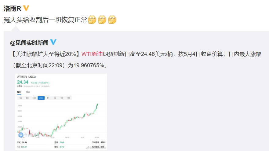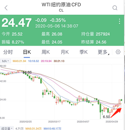 4月21日WTI原油5月期货合约出现历史负值的结算价-37.63美元/桶,中行原油宝的投资者被收割之后,油价迎来大反弹,6月交割的WTI原油期货价格收涨20.5%,报24.56美元/桶,这是什么概念,从中行穿仓那天起,已经涨了近280%!