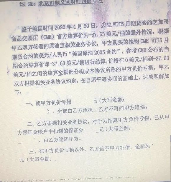一张疑似和解协议的截图也于当日流出。根据该和解协议,甲方(也就是投资人)购买的挂钩CME WTI 5月期货合约的美元/人民币“美国原油2005合约”,参考CME公布的当期合约结算价即-37.63美元/桶进行结算,价格在0美元/桶到-37.63美元/桶之间的结算金额部分构成本协议所称的甲方负价亏损。投资者因负油价意外情况产生的负价亏损将全部由中国银行承担、银行将不再追偿,因负价亏损划扣的保证金中行将进行退还。除了承担负价亏损外,中行还将对受损客户进行补偿。