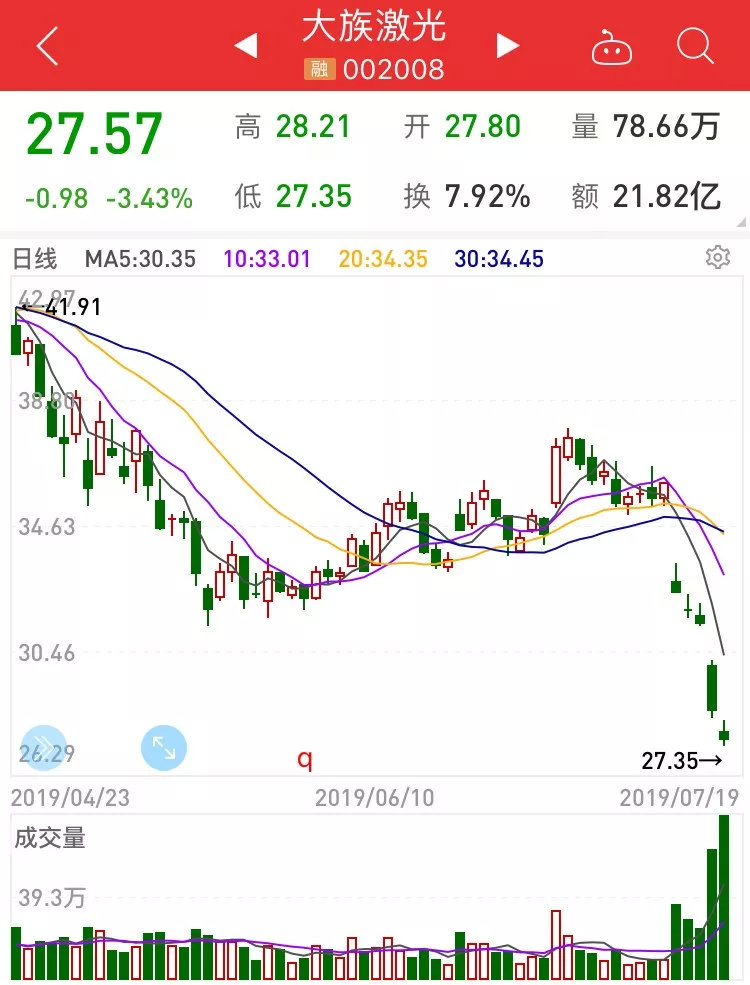大族激光累计跌幅23.54%居首,其本次股价下挫主要是受业绩预告大幅下滑影响。7月12日晚间,大族激光披露半年度业绩预告,公司预计上半年净利润为3.57亿元至4.07亿元,同比下降60%至65%。