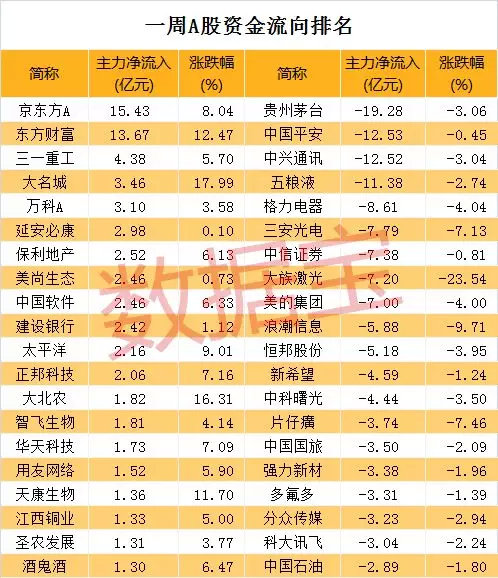 个股方面,不含近一个月上市的次新股,本周29股主力资金净流入超亿元。净流入规模最大的是京东方A,主力资金净流入15.43亿元,该股本周上涨8.04%。东方财富、三一重工主力资金净流入分别为13.67亿元、4.38亿元,本周分别上涨12.47%、5.7%。本周净流入规模较大还有的大名城、万科A、延安必康、保利地产、美尚生态等。