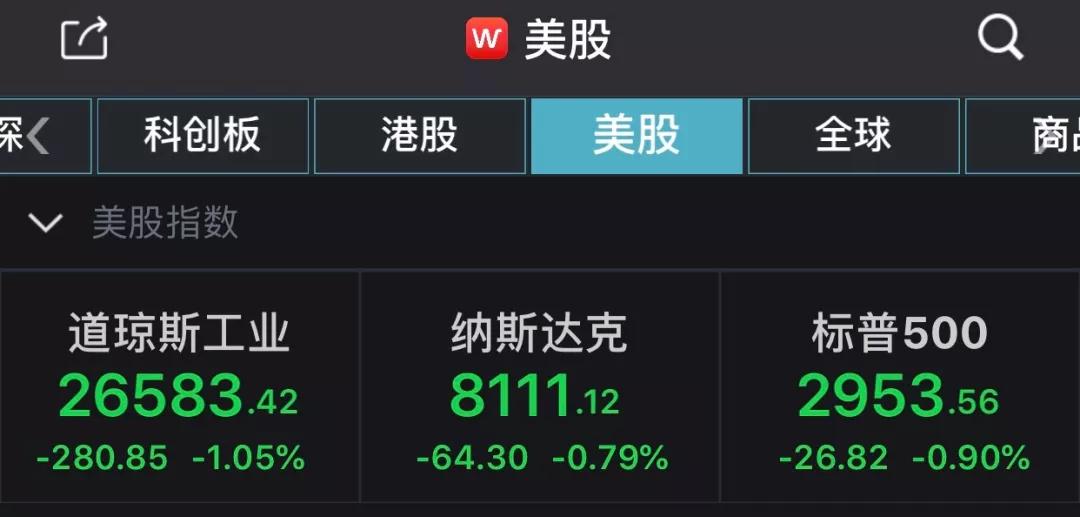 截至收盘美国三大股指全线收跌,道指跌近300点,跌幅为1.05%,纳指跌0.79%,标普500指数跌0.90%。