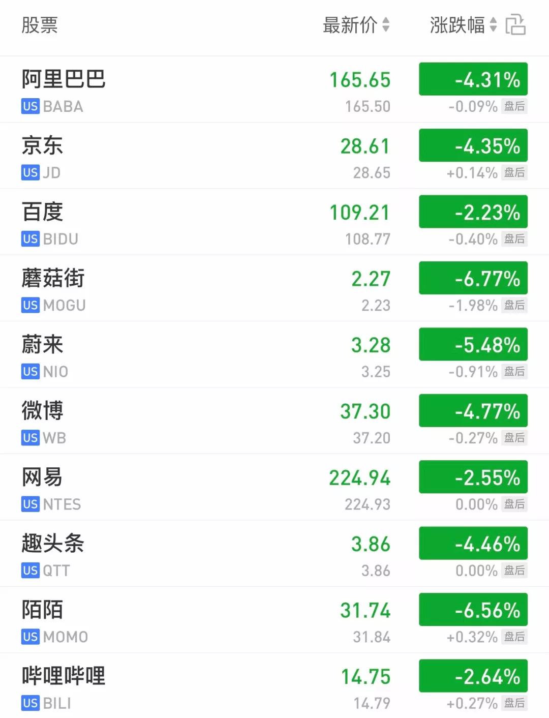 中概股随之跳水,虎牙直播跌逾7%,陌陌、趣店跌超6%,蔚来跌幅5.48%,阿里巴巴、京东、微博等跌幅均超4%,百度下跌2.23%。