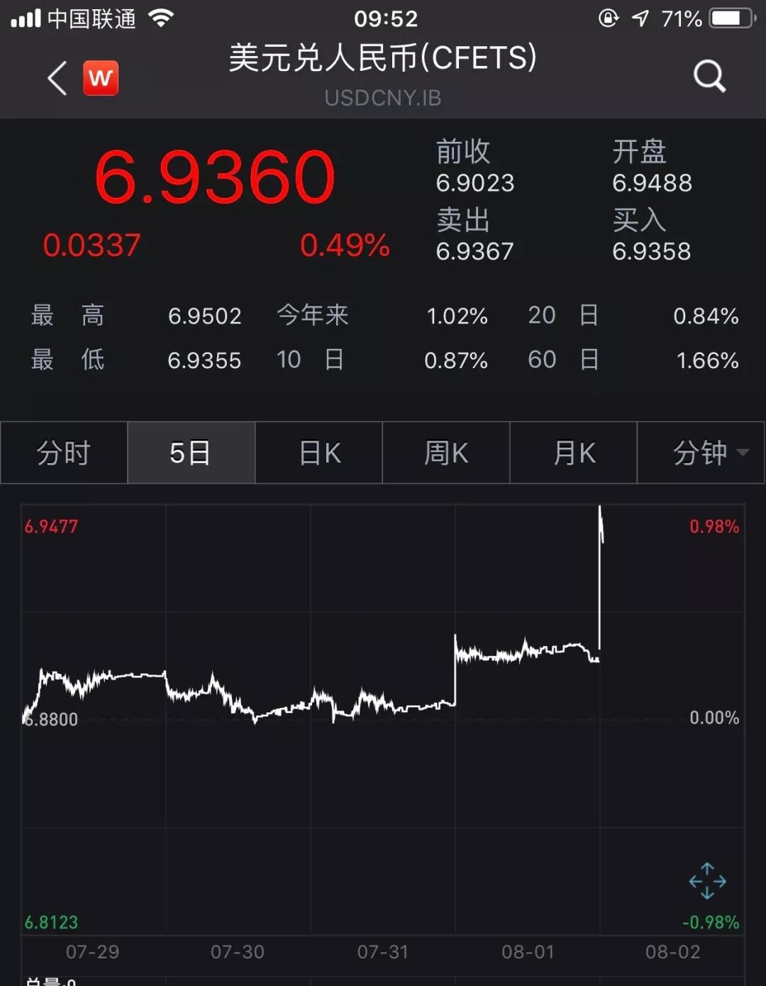 在岸人民币兑美元下跌约0.5%,接近6.94,日内跌幅达500点。