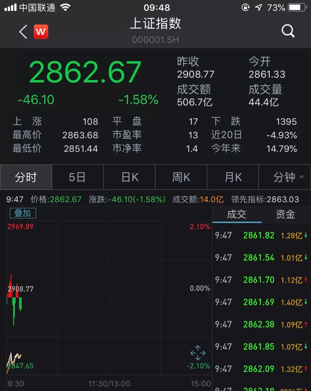 沪深两市集合竞价全线低开,仅百余只个股飘红。目前沪指跌约1.6%,失守2900点;深成指跌近2%;创业板指跌超1.6%。