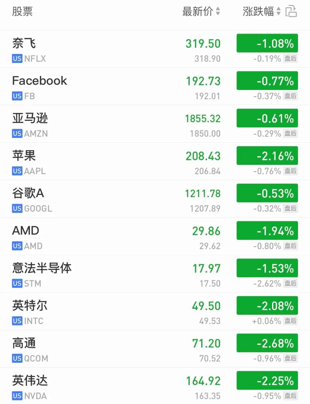 科技股中,芯片股跌幅较大,恩智浦跌超3%,高通、英伟达、英特尔等跌超2%,AMD、博通、台积电等跌超1%;特斯拉跌超3%,苹果跌逾2%,亚马逊跌超0.6%,亚马逊、脸书、谷歌、奈飞等均下跌。