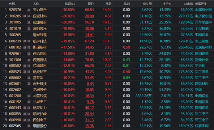 注:商业航天概念股集体活跃(截至12月12日收盘)