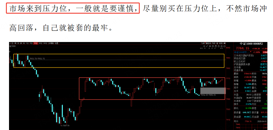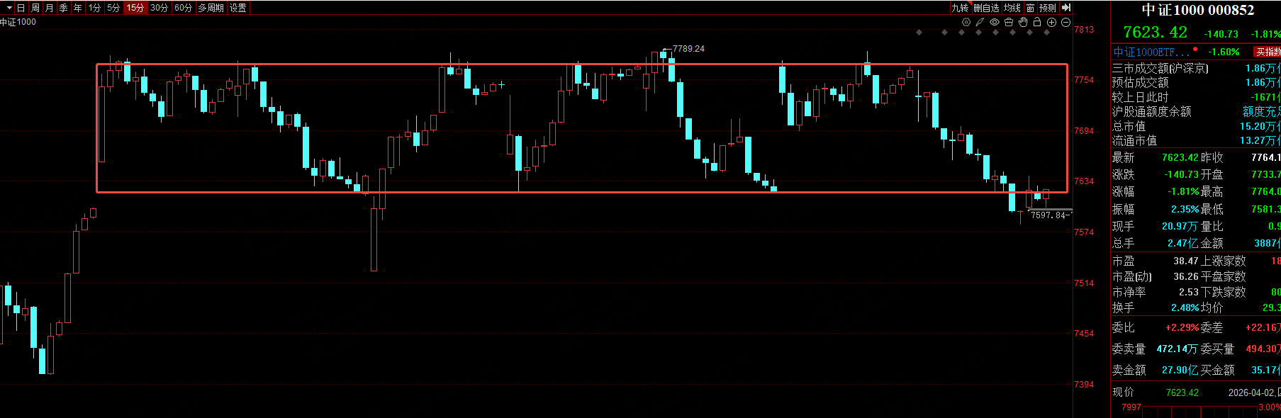 说实话中证1000今天的箱体有点小破位,明天收不回来,还要有大级别的调整。大家要注意这一点。