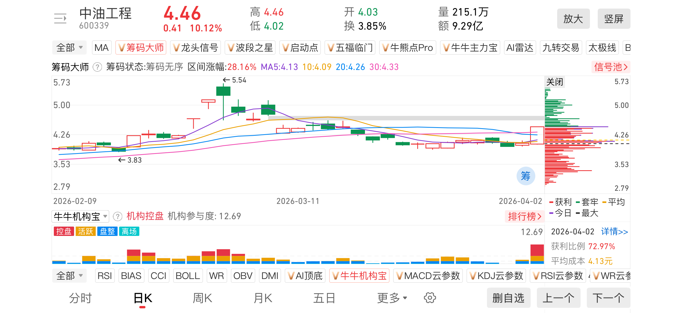 1)20260402-中油工程-600339-【筹码大师】和【牛牛机构宝】-近期出现弹信号且底部量柱由绿转红
