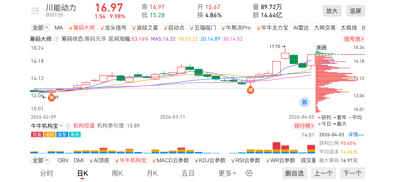 2)20260402-川能动力-000155-【筹码大师】和【牛牛机构宝】-近期出现弹信号且底部量柱由绿转红
