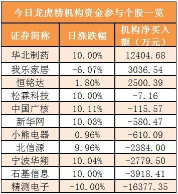 盘后龙虎榜数据显示,机构现身11股,其中华北制药(8.910, 0.81,10.00%)等3股呈现机构资金净买入,精测电子(46.710, -5.19, -10.00%)等8股呈现机构资金净卖出。