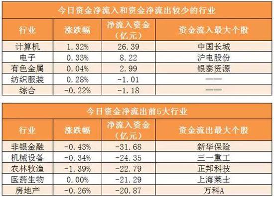 28个申万一级行业中,计算机、电子、有色金属等个行业实现资金净流入,其中计算机行业净流入26.39亿元居首。