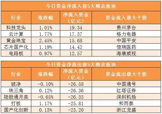 概念板块方面,今日科技龙头、云计算、黄金珠宝等概念板块资金呈现净流入,其中科技龙头概念净流入19.34亿元居首。
