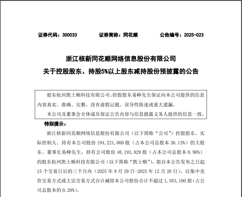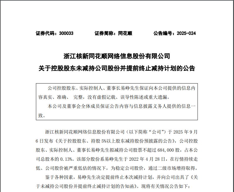 今日凌晨,同花顺发布公告称,公司于2025年9月6日发布《关于控股股东、持股5%以上股东减持股份预披露的公告》,公司控股股东、实际控制人、董事长易峥拟减持公司股票不超过684,000股,占本公司总股本的0.13%。该部分股份系易峥于2022年4月28日,在行情持续走低、公司股价被严重低估的情况下,为稳定公司股价,通过二级市场增持取得。鉴于各种因素,易峥决定提前终止本次减持计划。股东杭州凯士顺科技有限公司的减持计划不变。