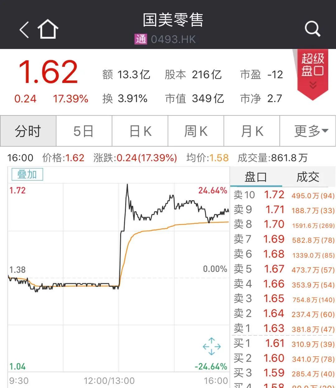 受此消息影响,“国美系”股票午后集体拉升,国美零售直线拉升,截至收盘,涨17.39%,报1.62港元,总市值249亿港元,成交额13.3亿港元。