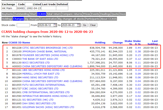 CCASS数据显示,过去一周中信证券、JP摩根、方正证券、东亚银行以及深港通等投资机构在持续买入国美零售。