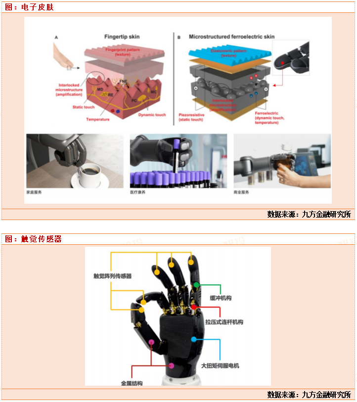触觉传感器:目前用于机器人的触觉传感器主要包括两大类:用于机器人精准力控的单体六维力/力矩传感器和用于机器人手指、表面的阵列式触觉传感器,也被称为电子皮肤。