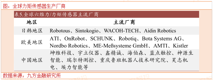 国内可以做六维力矩传感器宇立仪器(SRI)之外,如坤维科技、鑫精诚、海伯森、蓝点触控、神源生智能、瑞尔特测控等,均已有相关的产品落地并进入产业化应用。其他厂商如重庆鲁班机器人技术研究院、昊志机电、埃力智能,柯力传感,通过自主研发力传感器技术,已经具备六维力/力矩传感器的生产能力,未来有望可以通过下游客户验证。