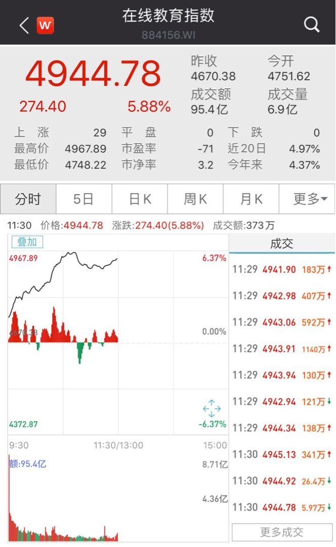 盘中在线教育概念应声全线走强,截至午间收盘,板块整体涨幅近6%。二六三、苏州科达、会畅通讯等多股涨停。科创板公司金山办公、致远互联也录得不俗涨幅。