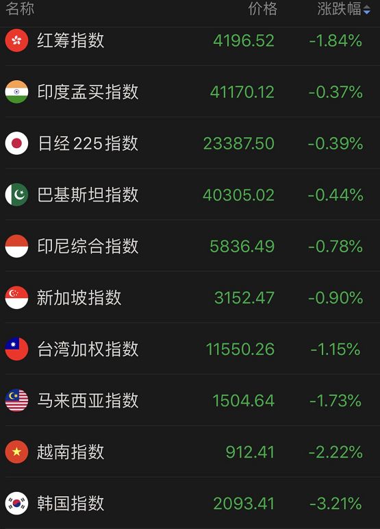 亚太股市2月24日持续走低,韩国KOSPI指数跌幅达3%,澳大利亚ASX200指数跌2.2%,印尼综合指数跌超1%,菲律宾基准股指跌2%,富时中国A50指数期货跌超1%。日本东京证券交易所因天皇诞辰补休日休市一日。