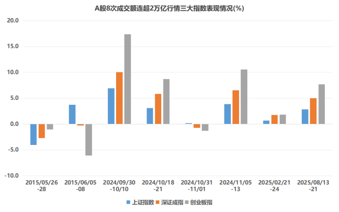注:A股8次成交额连超2万亿行情三大指数表现情况(截至8月21日收盘)