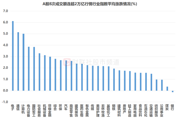 注:A股8次成交额连超2万亿行情行业指数平均涨跌情况(截至8月21日收盘)