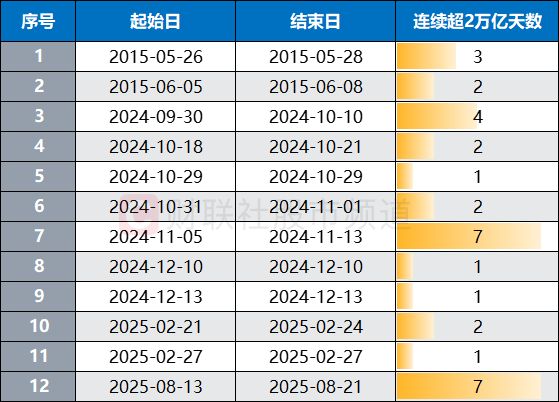 作为主要量能指标,市场成交额的高低一直倍受投资者所关注。从历史行情上看,截至今日收盘,A股单日成交额累计共有32次站上2万亿大关,其中,2024年期间共有18次,2025年、2015年期间各有10次、5次。若统计成交额连续超2万亿的行情,其仅有8次。仅截至8月21日数据,目前最高纪录仍由2024年11月5日至13日期间的7个交易日录得。