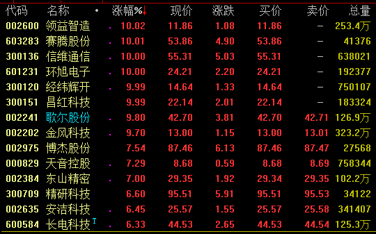 苹果概念今日盘中走势强劲,截至收盘,领益智造、赛腾股份、信维通信、环旭电子、经纬辉开、昌红科技等涨停,歌尔股份、金风科技逼近涨停。