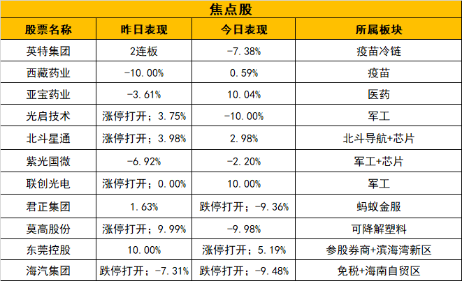 高位股这边一荣俱荣,一损俱损。前两天光启技术虽然比君正集团强势,但市场总核心还是看君正集团。君正集团今天没走反包,连续2次大分歧代表走势变弱,那么情绪混沌期向退潮期开始转变,那么早上独立走强的北斗星通、东莞控股等股最后也难独善其身。今天亮点的反包多为中位股,如联创光电、亚宝药业等股反包涨停。高位股退潮确定后,市场炒作估计会在独立品种或低位题材上,短期难有君正集团这样的大龙头和像军工、疫苗等这样的换手大题材。