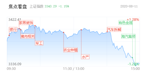 8月11日,三大股指尾盘跳水,两市个股普跌,涨停个股不足40家,跌停个股近20家,整体分化较为严重,午后市场亏钱效应扩大。板块上,证券、保险等权重板块尾盘跳水带动指数下跌,挫伤市场情绪,白酒、食品饮料等稍显强势,市场题材集中在军工、农业等防御板块,但在尾盘均出现回调,个股上,光启技术、君正集团等高标人气股开始杀跌,整体看,高位股加速补跌,市场题材低迷,资金表现谨慎。