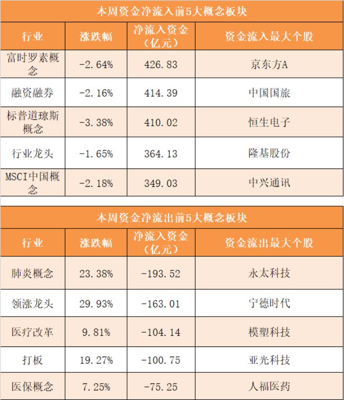概念板块方面,本周富时罗素概念、融资融券、标普道琼斯概念、行业龙头等概念板块资金呈现净流入,其中富时罗素概念净流入426.83亿元居首。