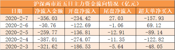 本周两市主力资金累计净流出1355.19亿元。其中周五(2月7日)主力资金开盘净流出234.42亿元,尾盘净流入27.03亿元,全天净流出356.03亿元。