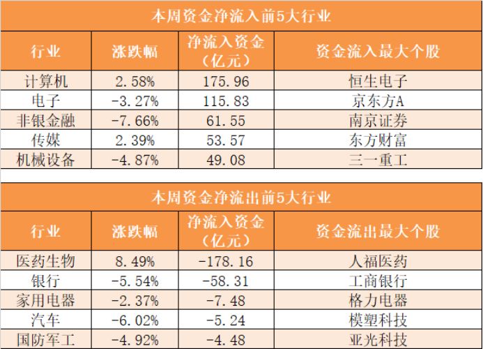 本周28个申万一级行业中,21个行业实现资金净流入,其中计算机行业净流入175.96亿元居首。