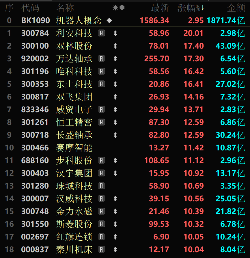 人形机器人、电机制造、减速器、PEEK材料等细分板块也全线大涨,襄阳轴承、秦川机床、南方精工、中马传动等批量涨停。