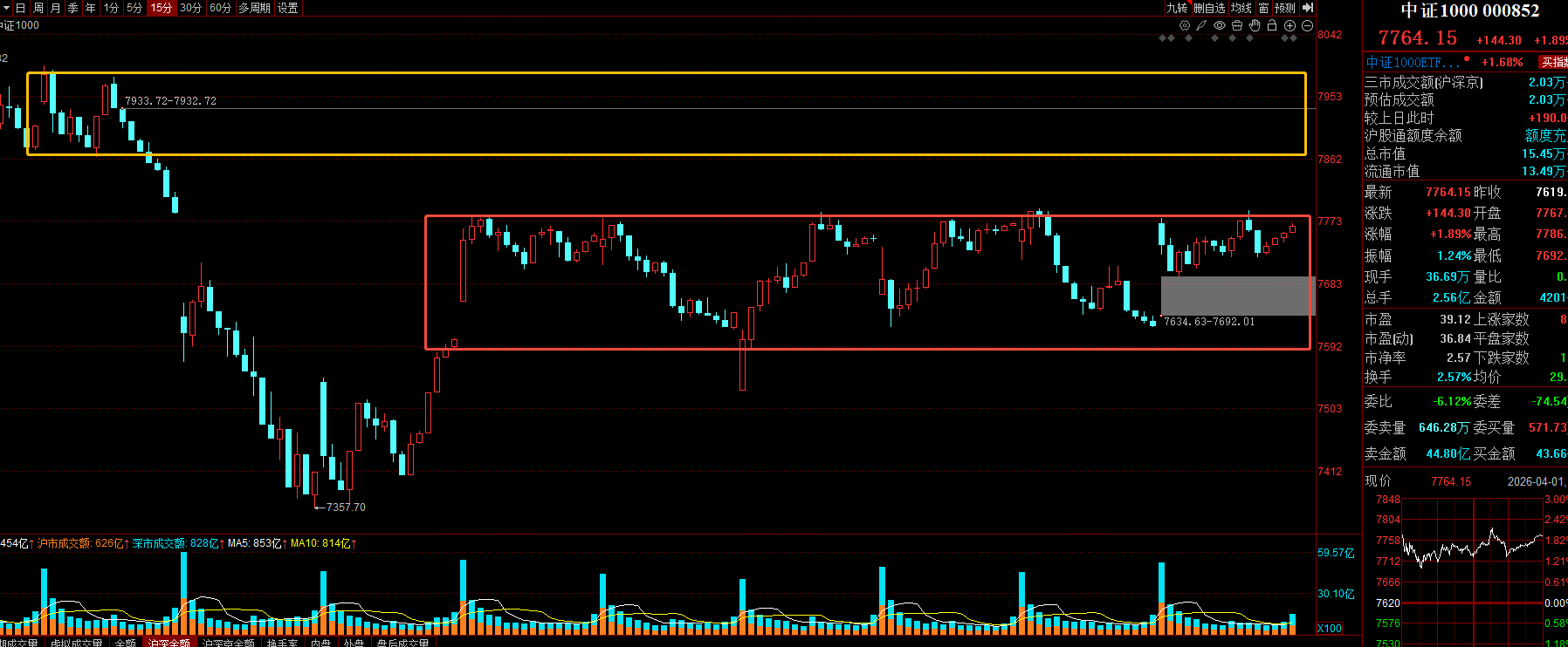最近A股弱是因为中证1000和中证2000都来到了15分钟级别的箱底位置,这个位置突破不了,市场就打不出高度。