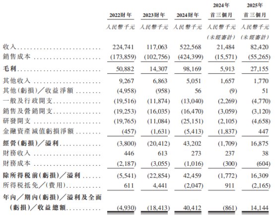 于2022财年、2023财年、2024财年及2025年首三个月,公司实现收入分别约为2.25亿、1.17亿、5.23亿、8242万元(单位为人民币,下同);同期,年/期内溢利及全面收益总额分别为-493万、-1841.3万、4041.2万、1414.4万元。