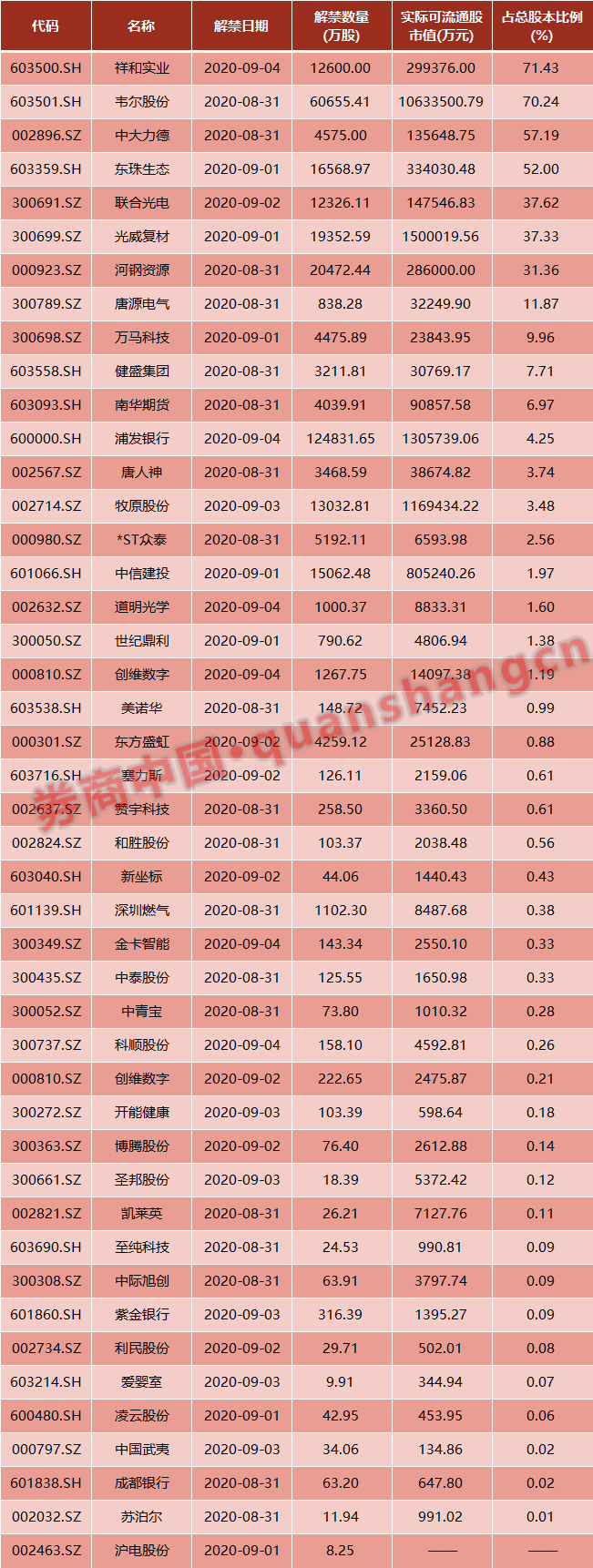 从解禁占比来看,解禁占比居前三位的是:祥和实业(71.43%)、韦尔股份(70.24%)、中大力德(57.19%)。