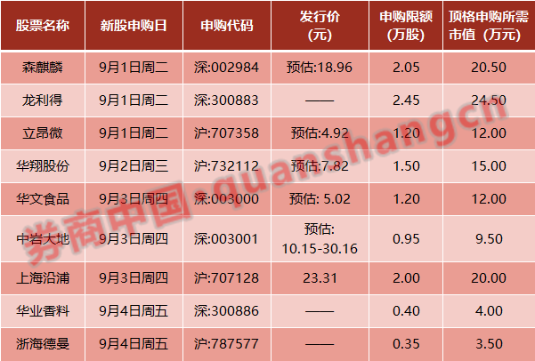 本周将有9只新股发行,本周二(9月1日)申购的是森麒麟、龙利得、立昂微;本周三(9月2日)申购的是华翔股份;本周四(9月3日)申购的是华文食品、中岩大地、上海沿浦;本周五(9月4日)申购的是华业香料、浙海德曼。