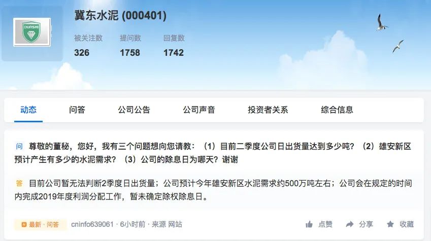 此外,公司表示,河北和天津区域的销量超过了去年同期的水平,尤其是雄安新区4月份增量比较明显。5月8日,冀东水泥在互动平台上答投资者问时表示,预计2020年雄安新区的水泥需求约有500万吨左右。