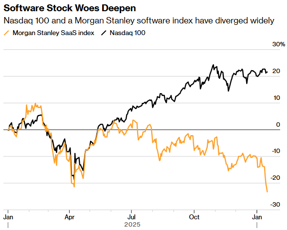 新年伊始,美股市场原本期待低迷的软件股能迎来复苏的机会。然而,事与愿违,该板块却遭遇了多年来最糟糕的开局。数据显示,摩根士丹利追踪的一组软件即服务股票今年迄今已下跌15%,此前预计2025年将下跌11%,这是自2022年以来最糟糕的开局。