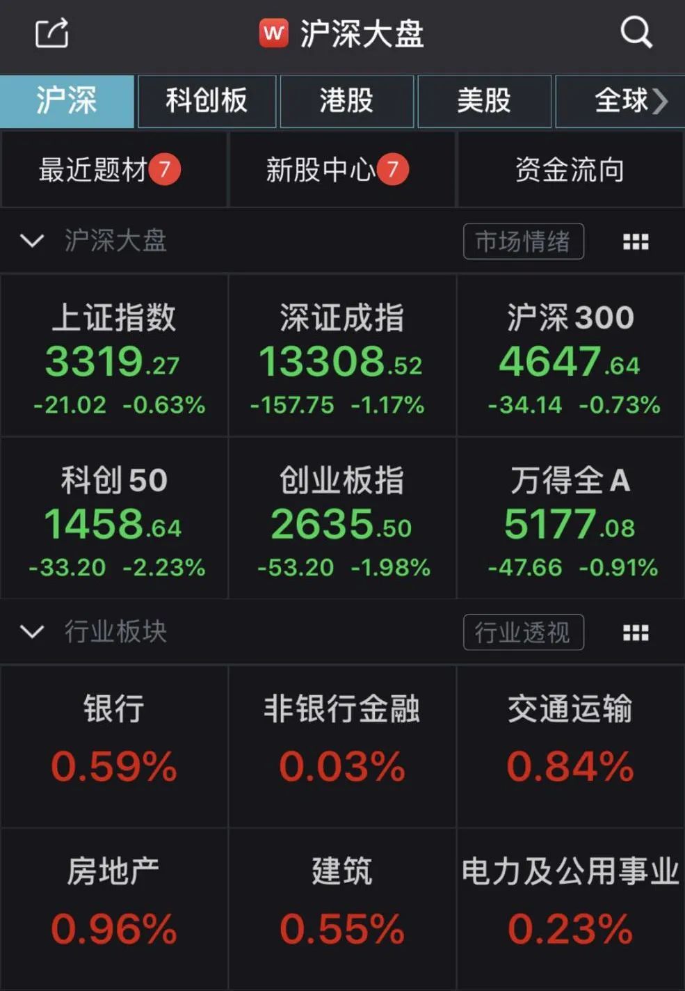 8月12日,上证指数下跌0.63%,报3319.27,盘中一度失守3300点;深证成指下跌1.17%,报13308.52点,盘中一度跌逾2%;创业板指下跌1.98%,报2635.50,盘中一度跌逾4%。两市近1400只个股上涨,59只个股涨停,超2400只个股下跌,跌停股28只。